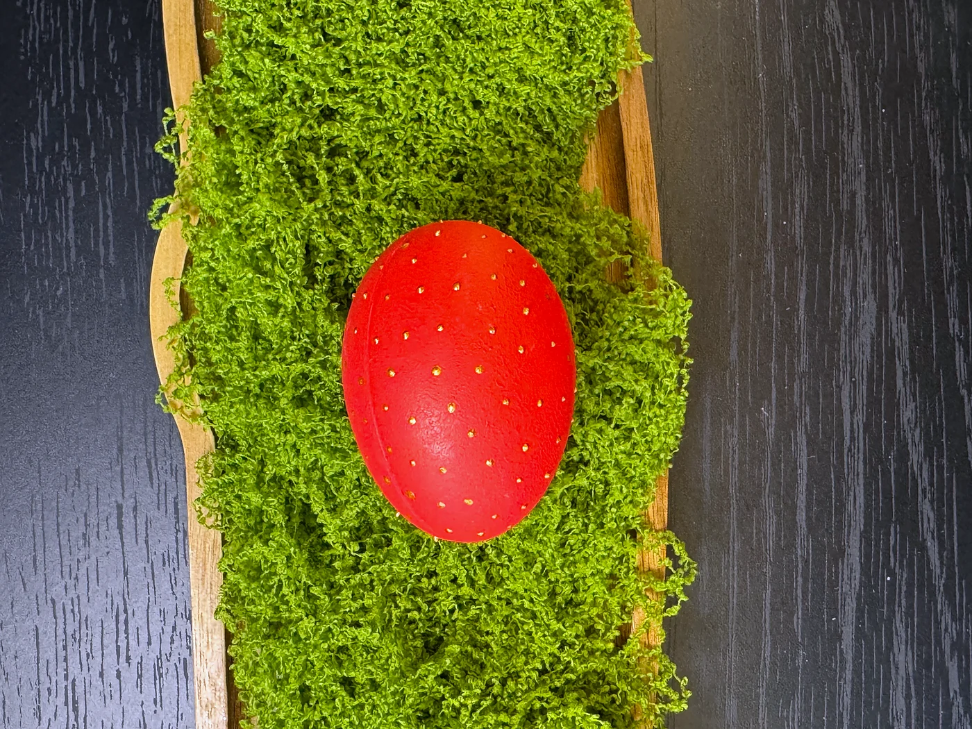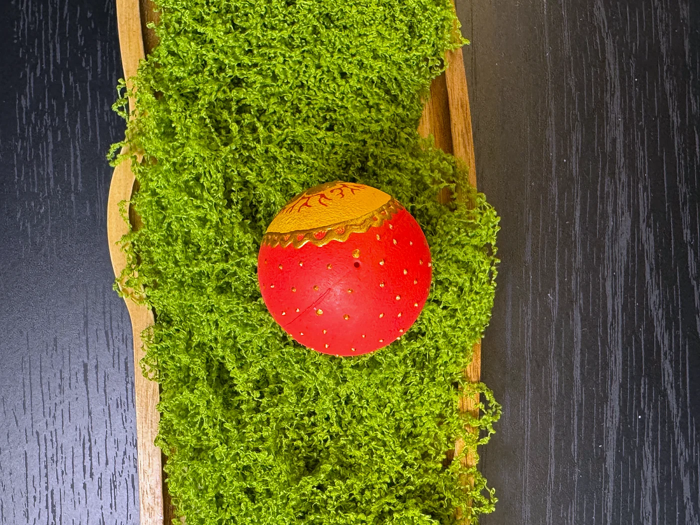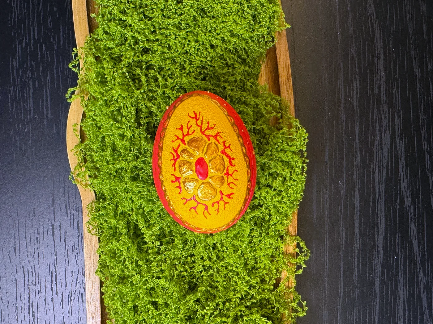 Golden-yellow egg with a central folk motif in warm red and orange. Stylised floral and leaf shapes echo centuries-old Eastern European Easter egg tradition.