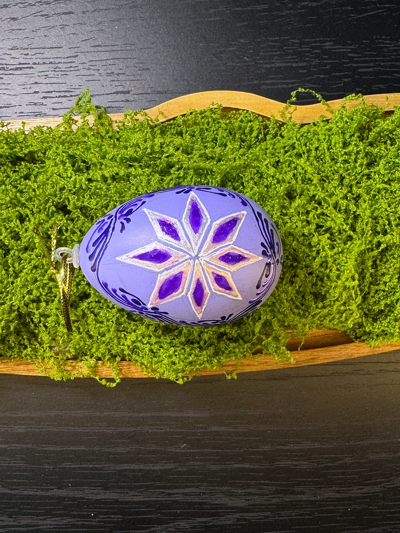 Lilac-purple egg with a large eight-pointed star. The star's petals alternate between deep purple and magenta-pink, outlined by fine white lines creating a stained-glass effect.