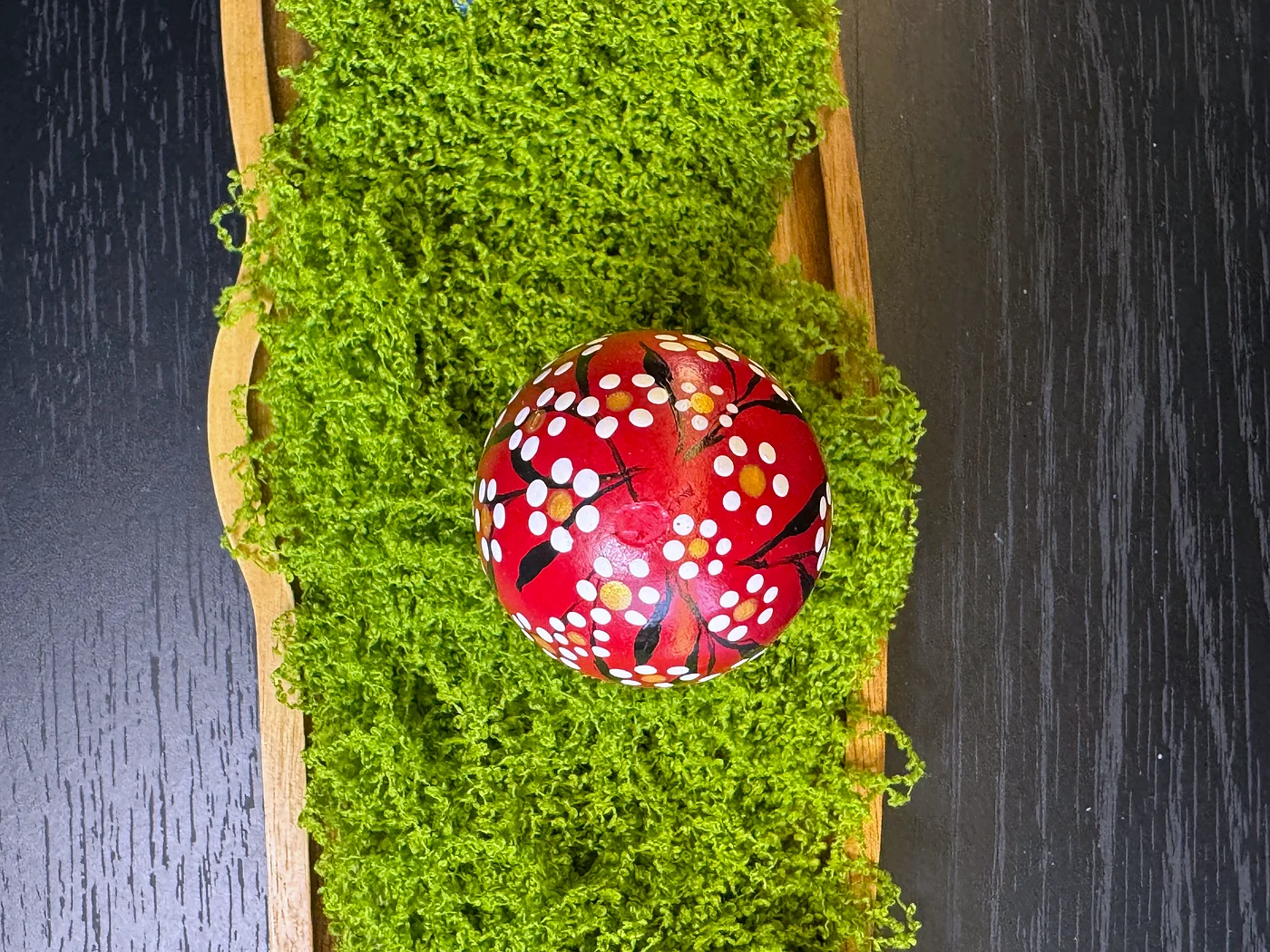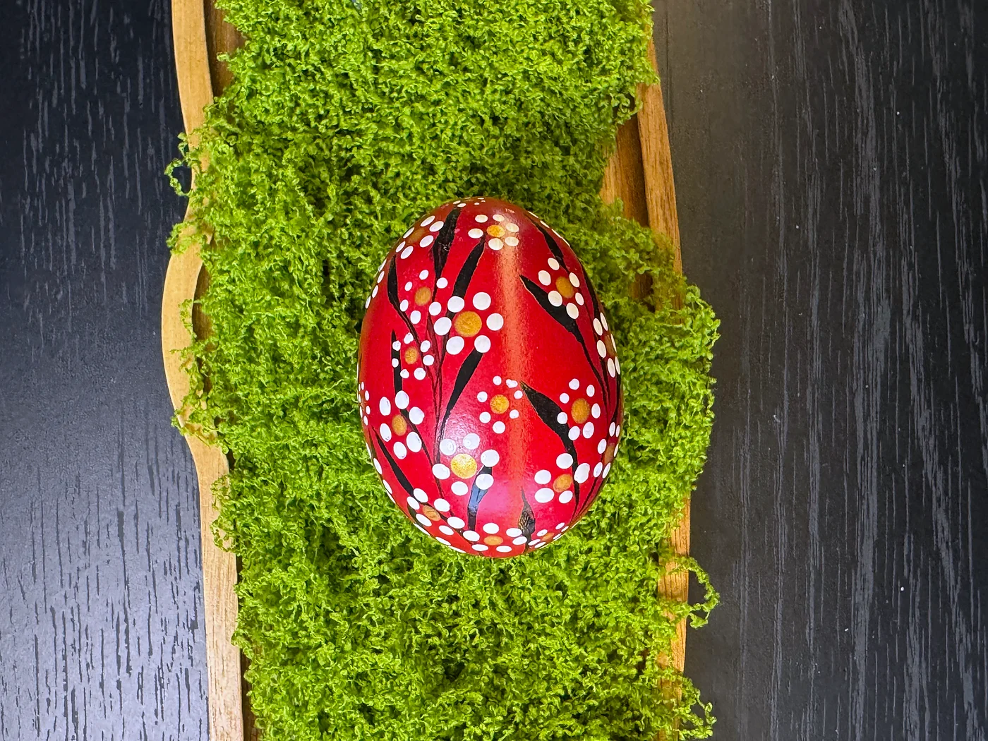 Deep crimson egg adorned with bold, rounded black brushstrokes and clusters of raised dots in white, yellow, and orange. Dynamic curved lines suggest movement and energy.