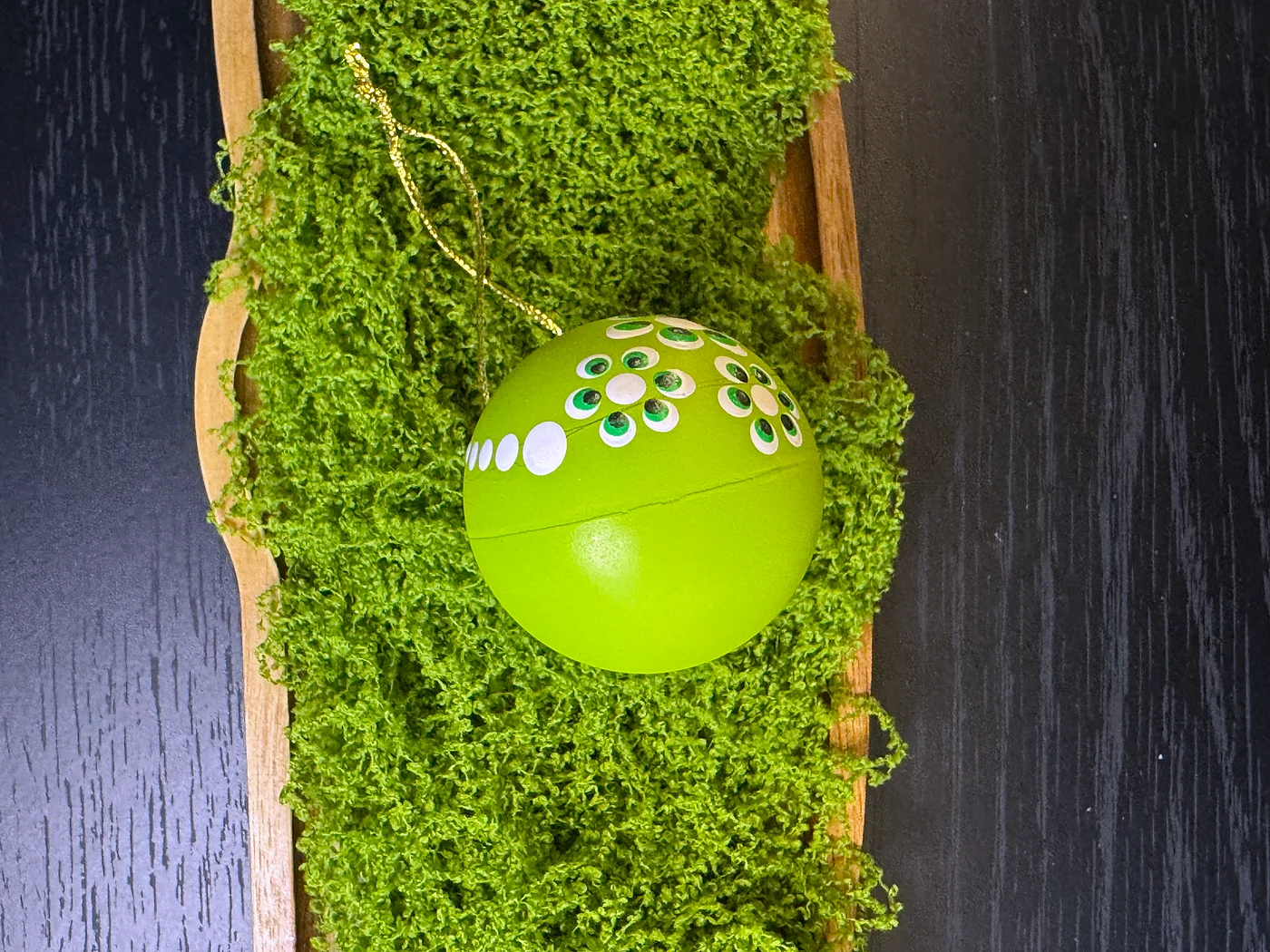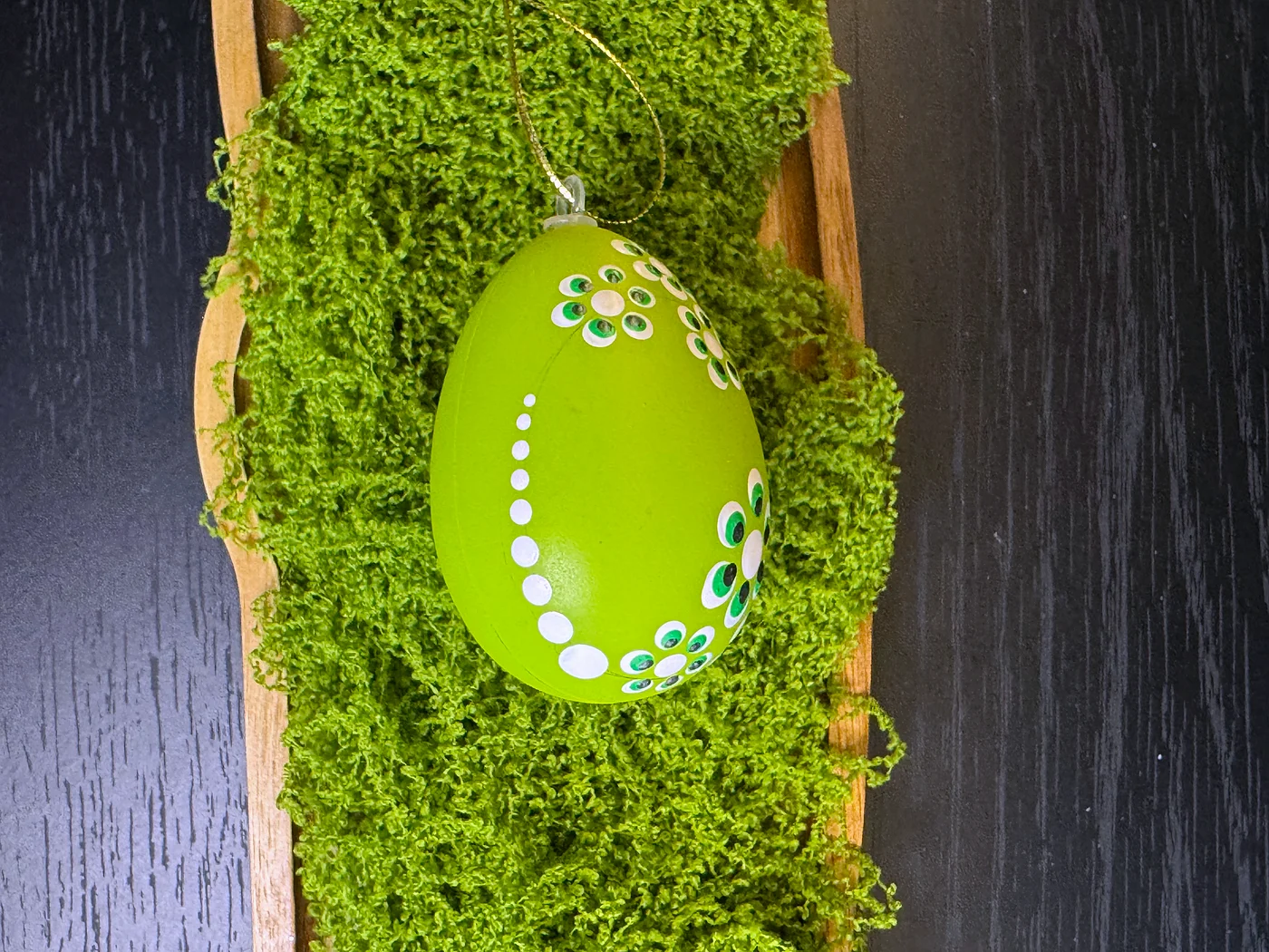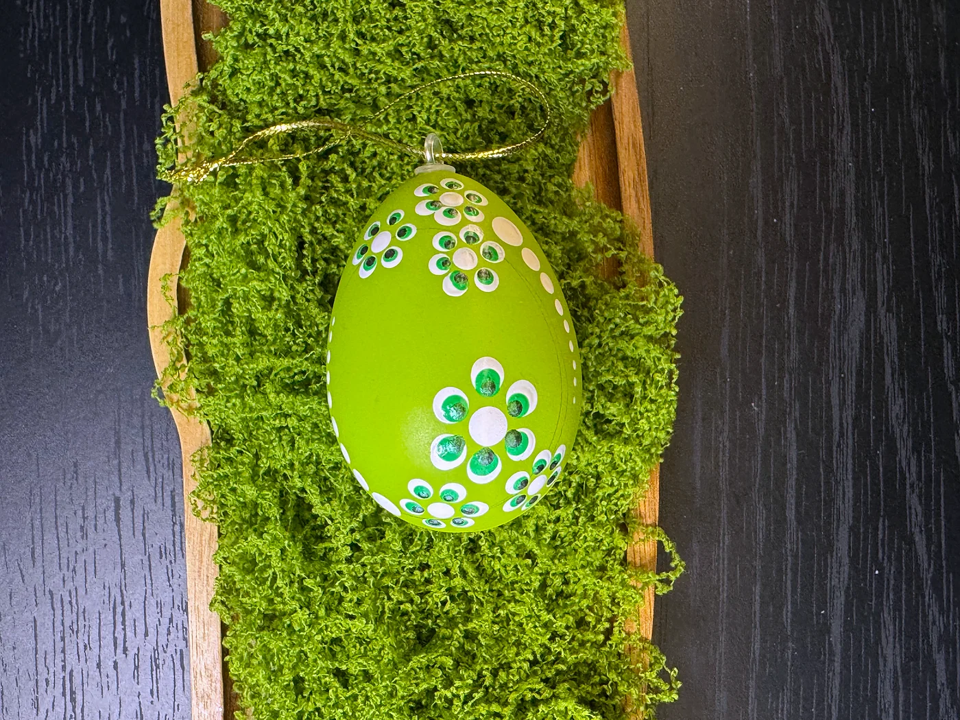 Vibrant lime-green egg cheerfully dotted with hand-painted daisies in white and darker green. The fresh, saturated background evokes new spring grass.
