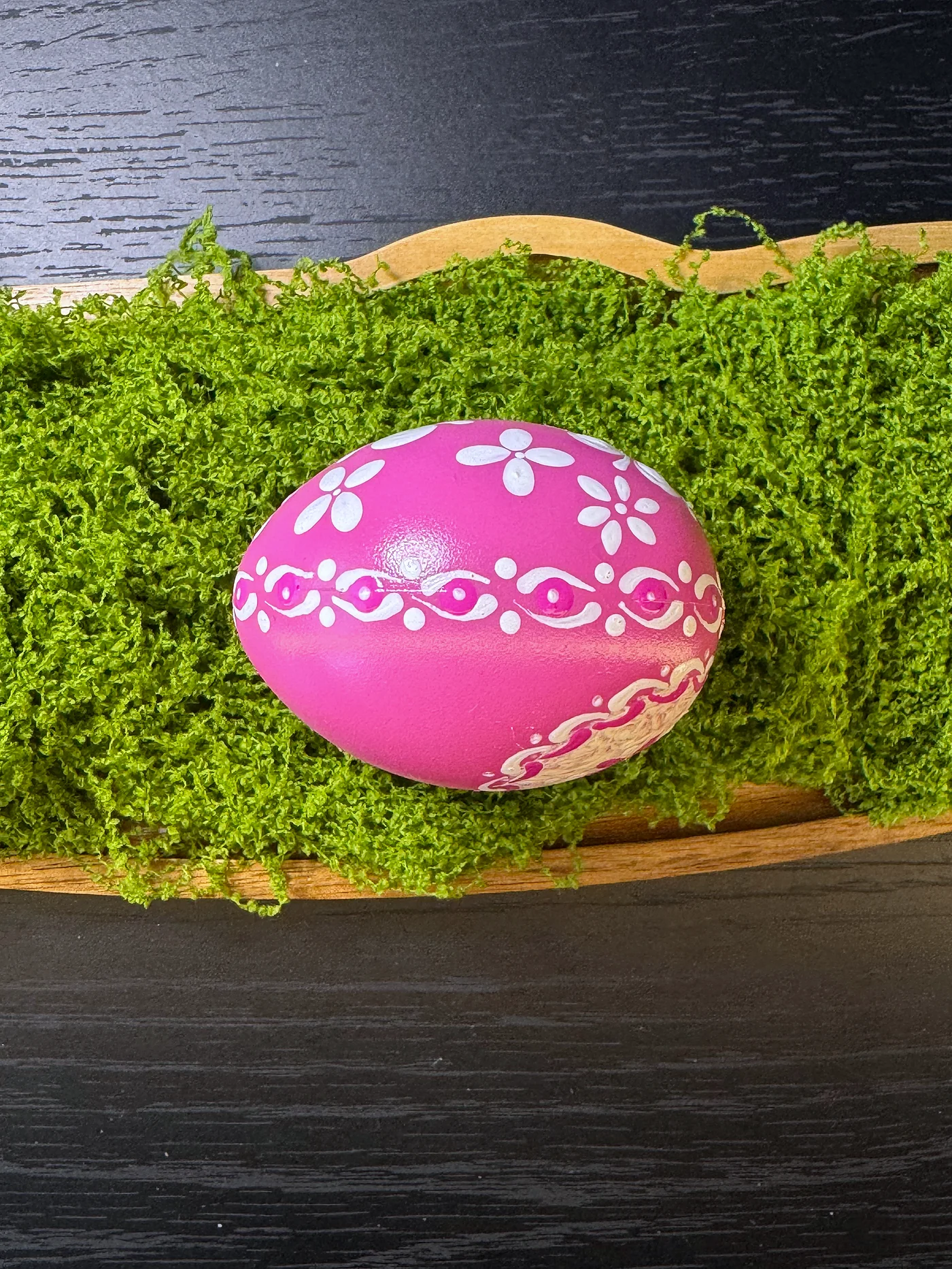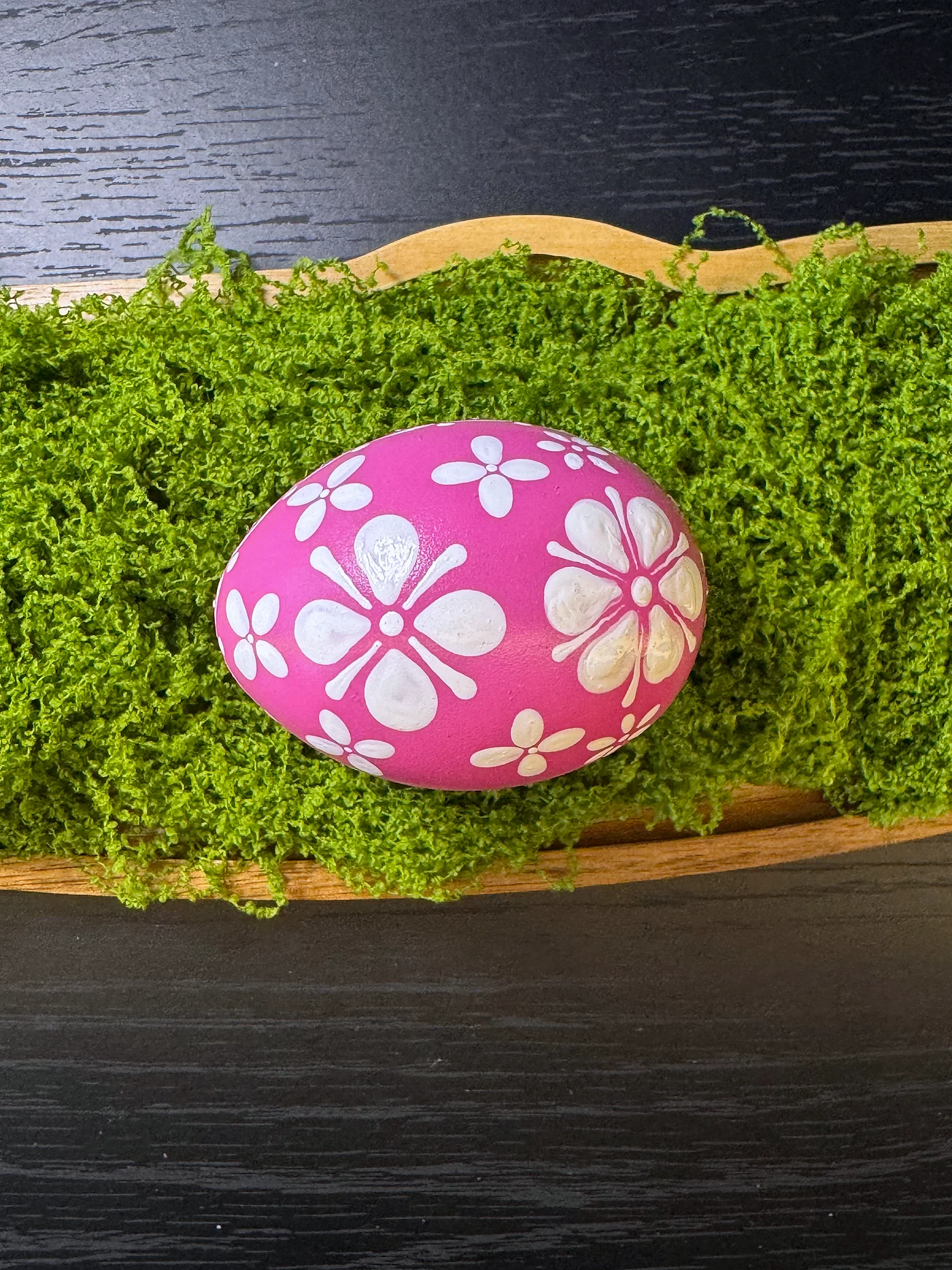 Smooth magenta-pink egg with a single oval medallion bordered by a white scalloped edge, containing a six-petalled flower in deep pink and white.