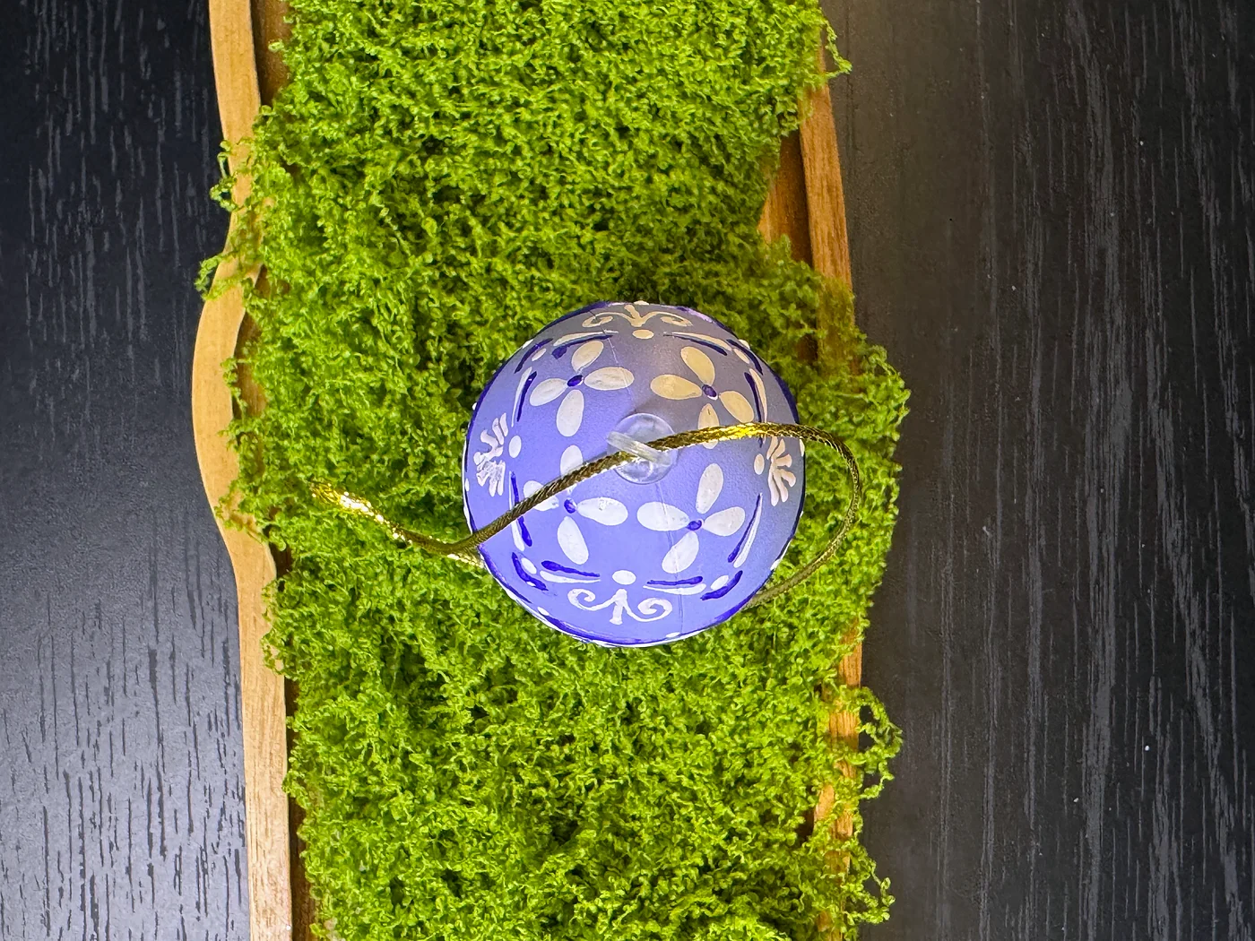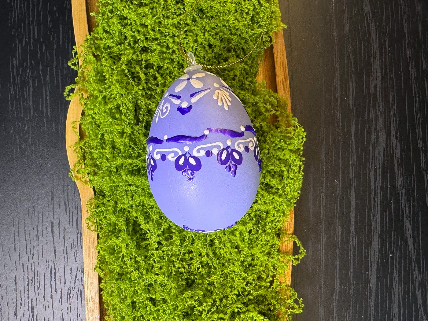 Soft purple egg encircled by a hand-painted garland of white and dark-purple floral elements. The layered purple-on-purple palette creates a dreamy, elegant atmosphere.