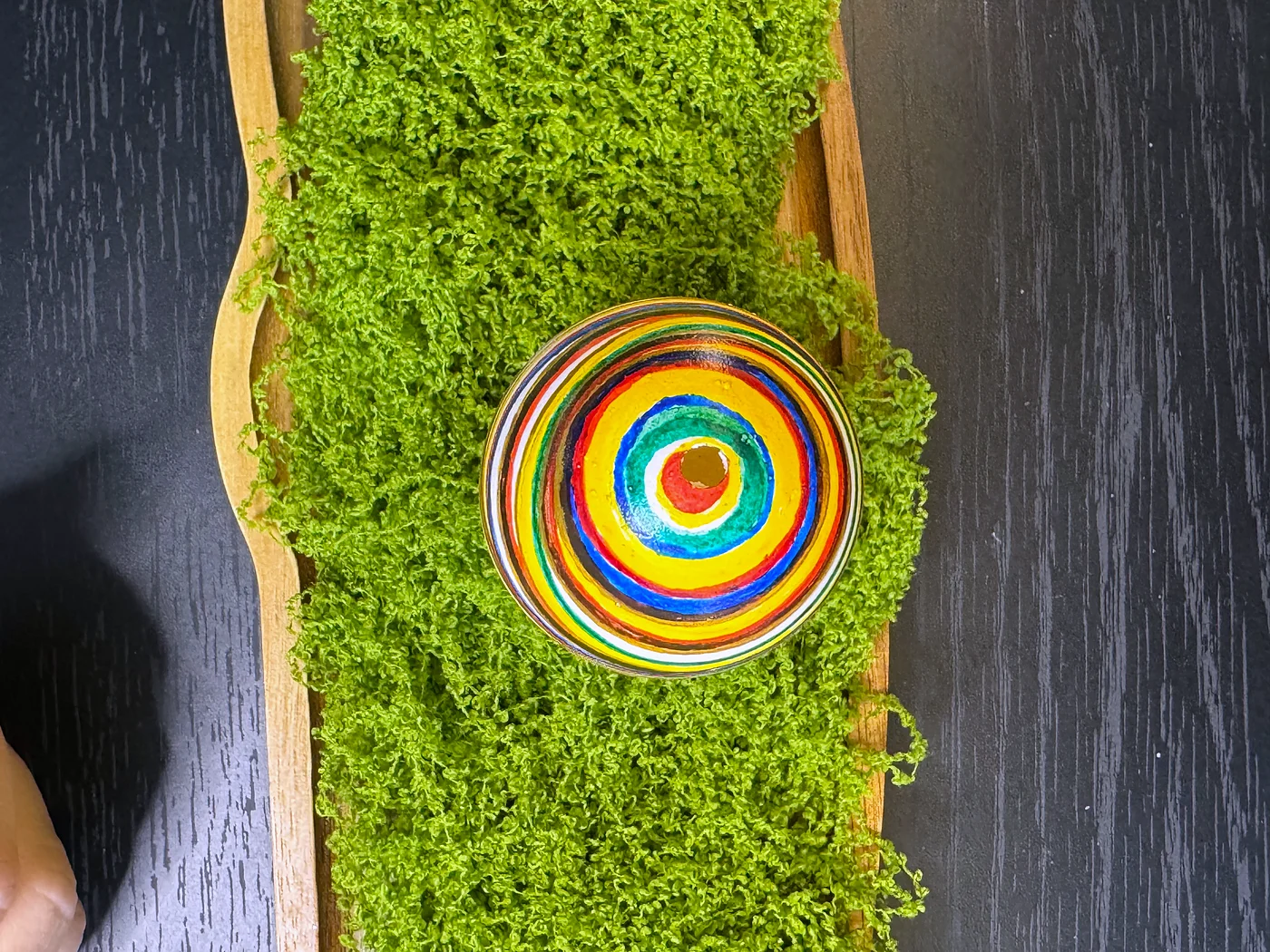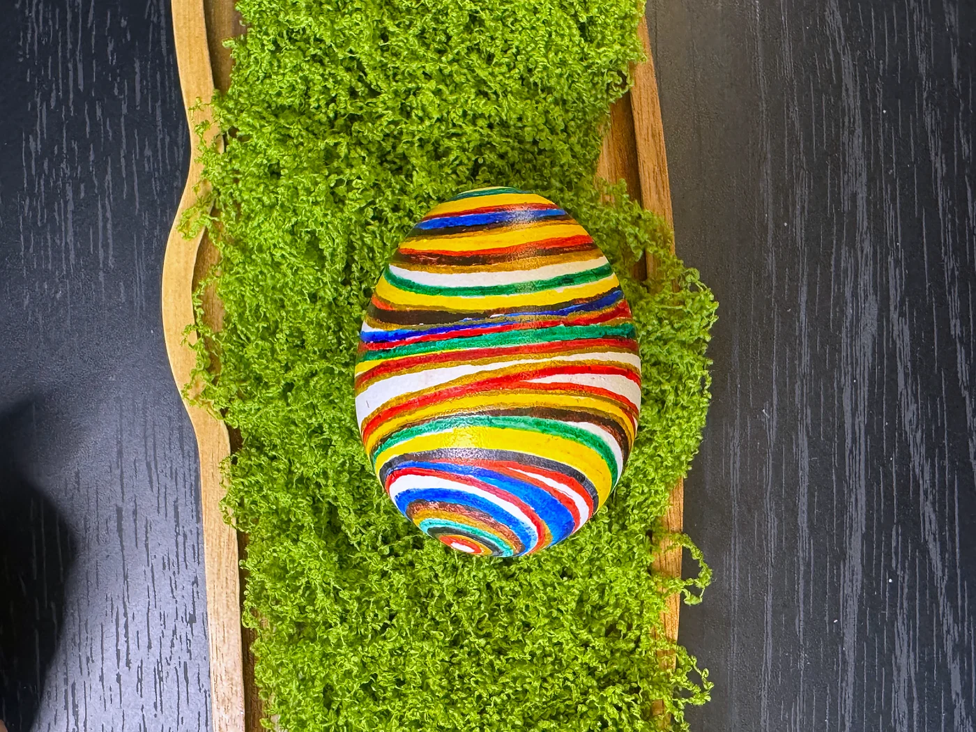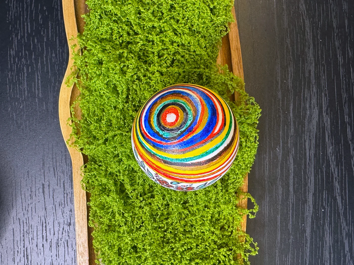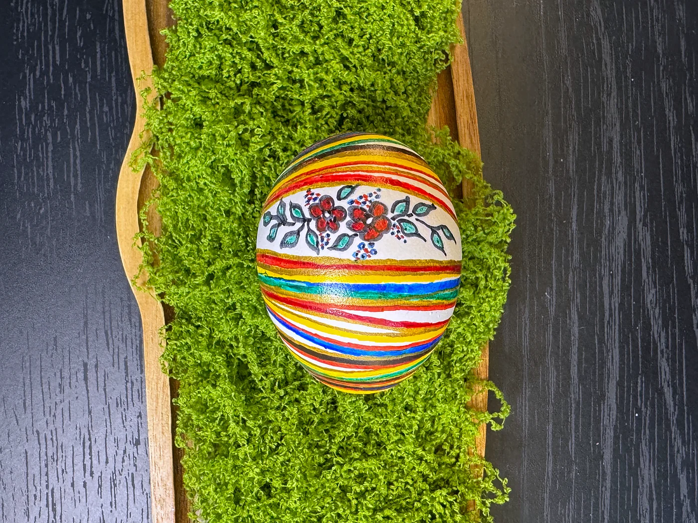 Hand-painted floral design on a multicolored striped background. Thin horizontal bands of green, yellow, orange, red, and blue wrap around the egg, overlaid with a bouquet of roses and leaves in folk style.