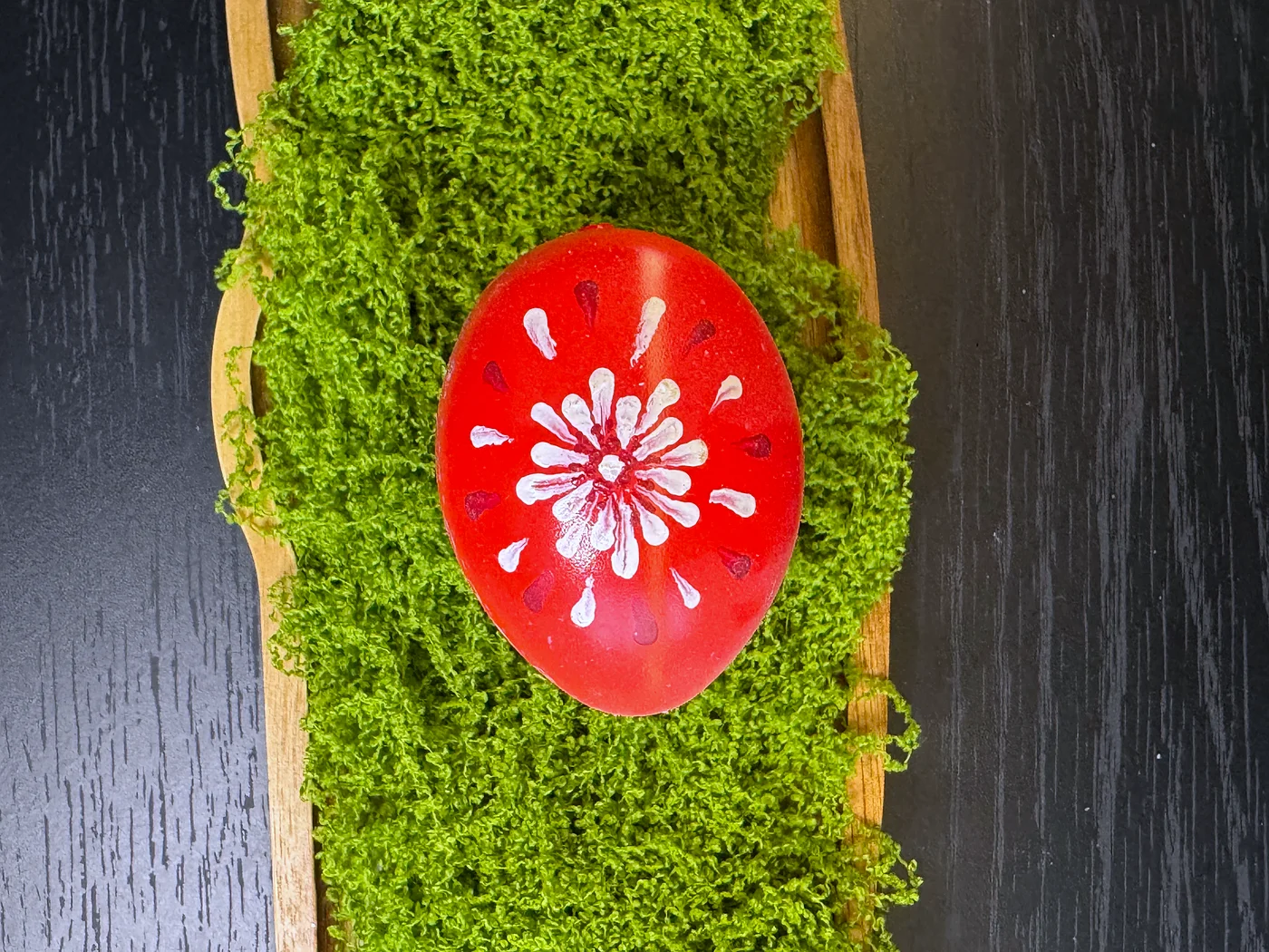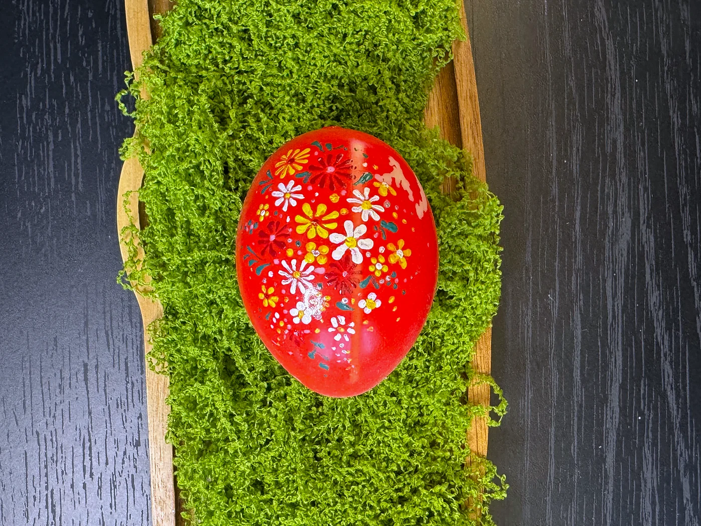 Hand-painted scattered flowers on a glossy red base. Small daisies and star-shaped flowers in white, yellow, and orange are freely sprinkled across the entire surface.