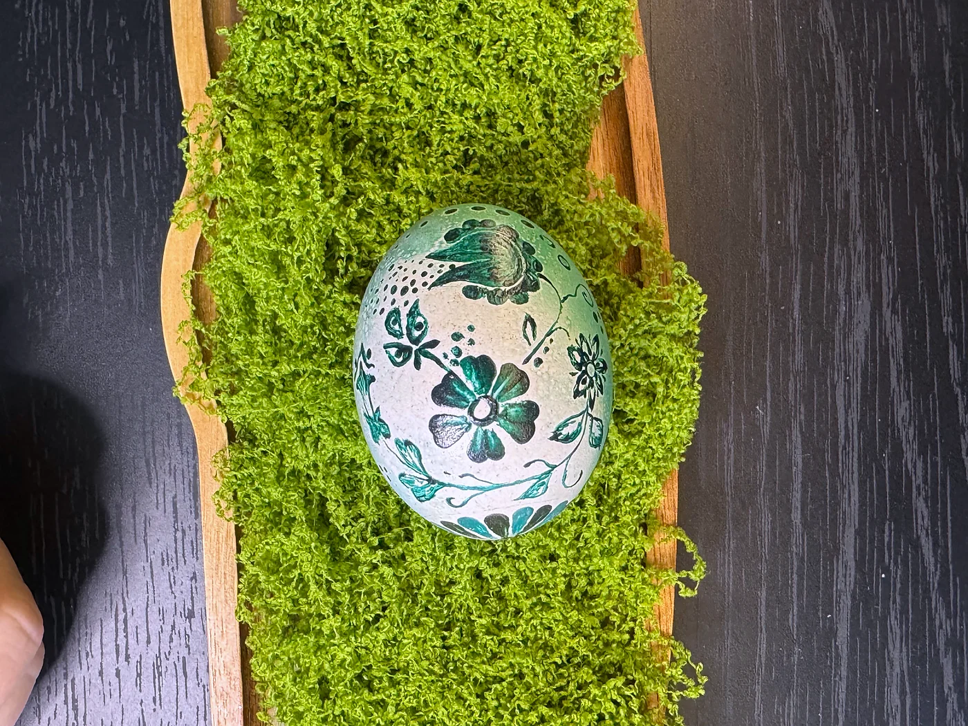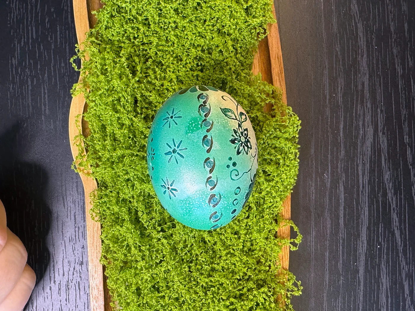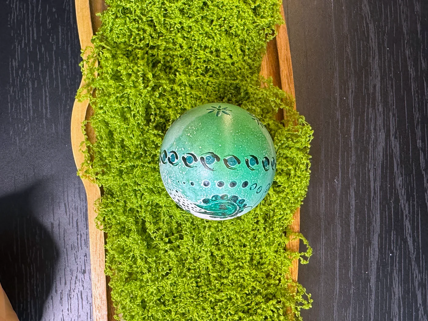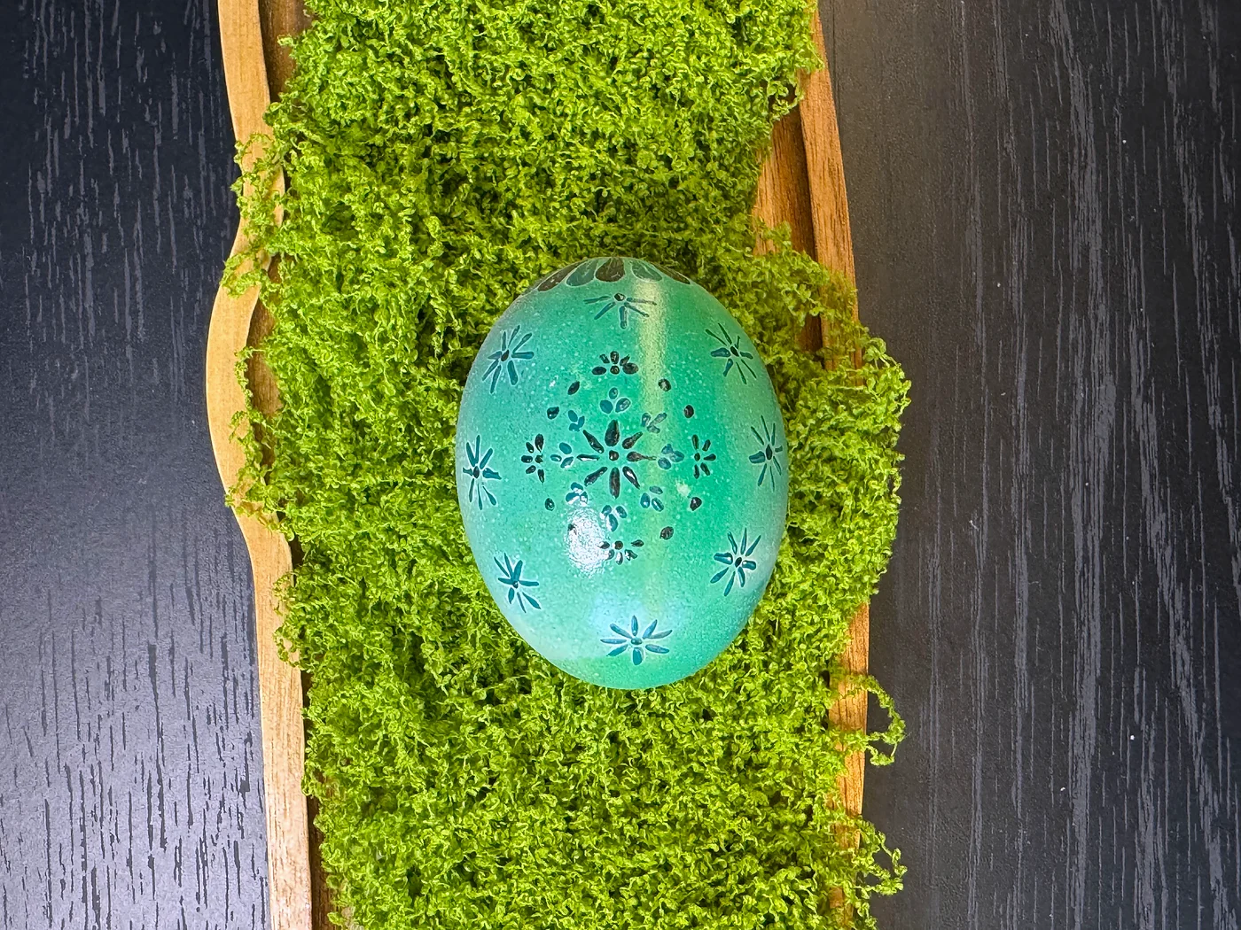 Hand-painted design on a soft sea-green dyed shell. Scattered star and snowflake motifs in dark teal and black spread across the surface. The cool palette from mint to jade creates a serene, wintry elegance.