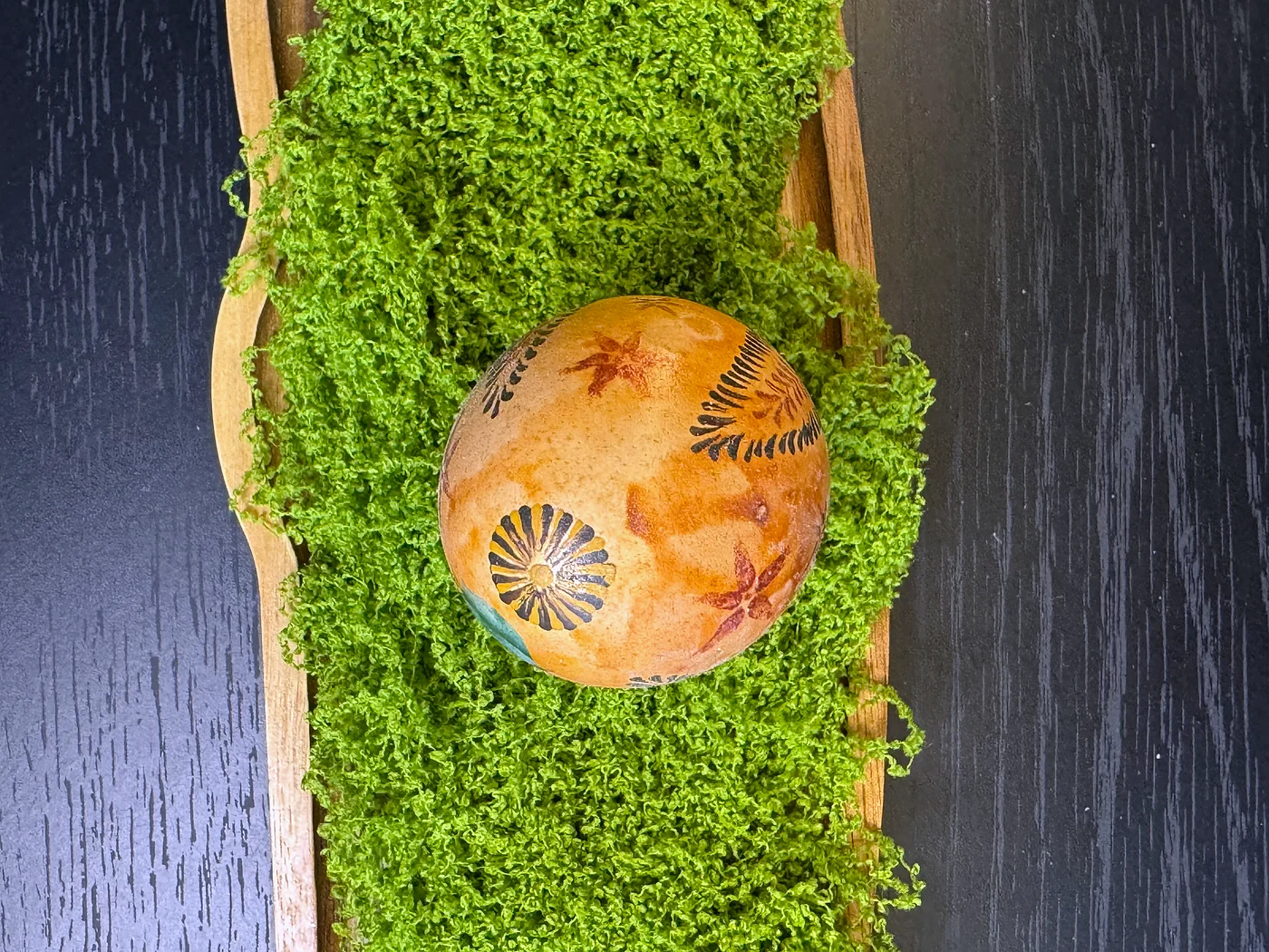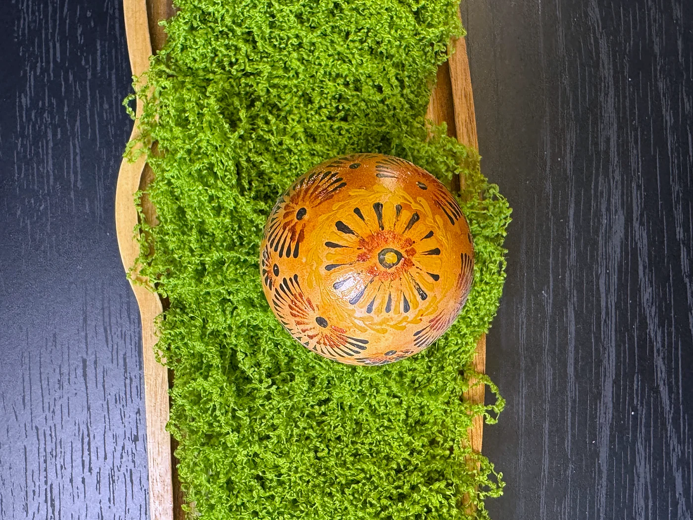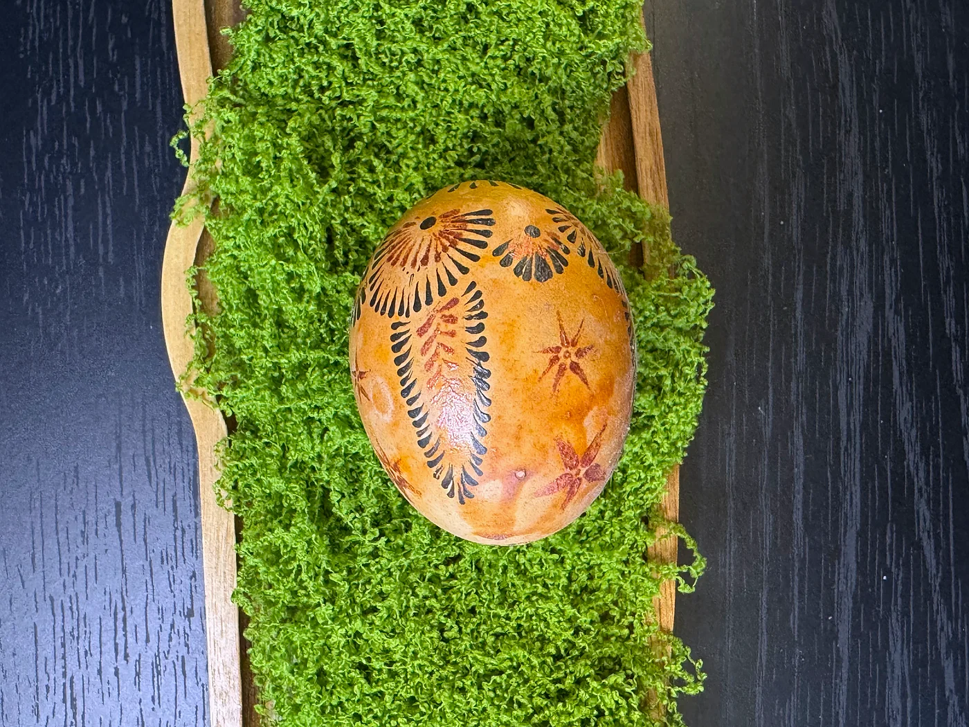 Ručno oslikan dizajn u toplim medeno-jantarnim i tamnosmeđim tonovima. Vijugavi listovi paprati i lepezasti motivi prekrivaju površinu, evocirajući jesenje lišće i obilje žetve.