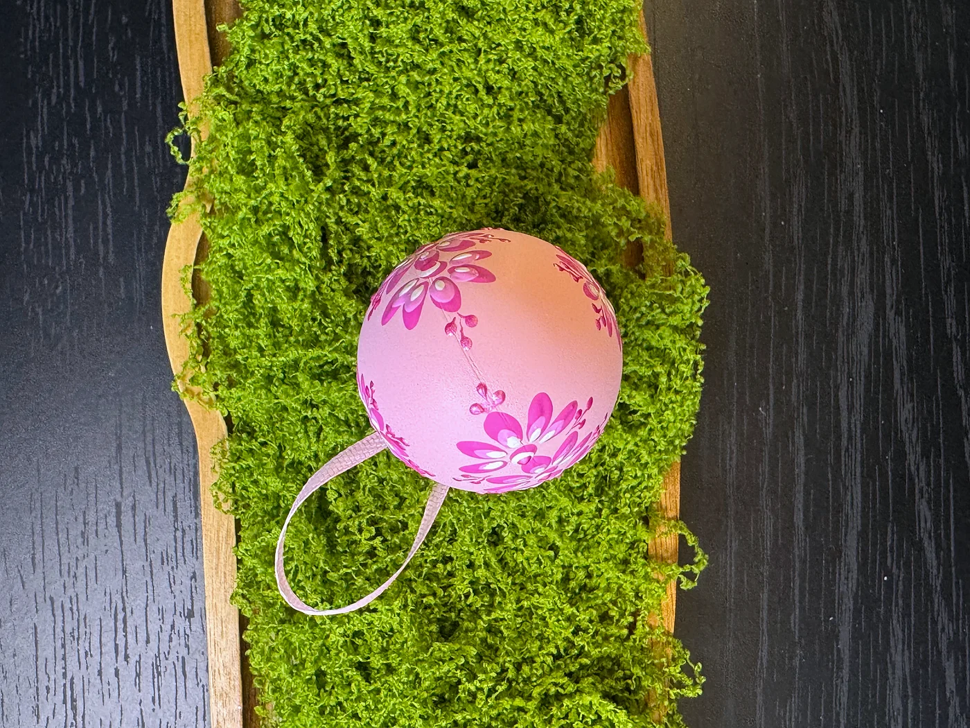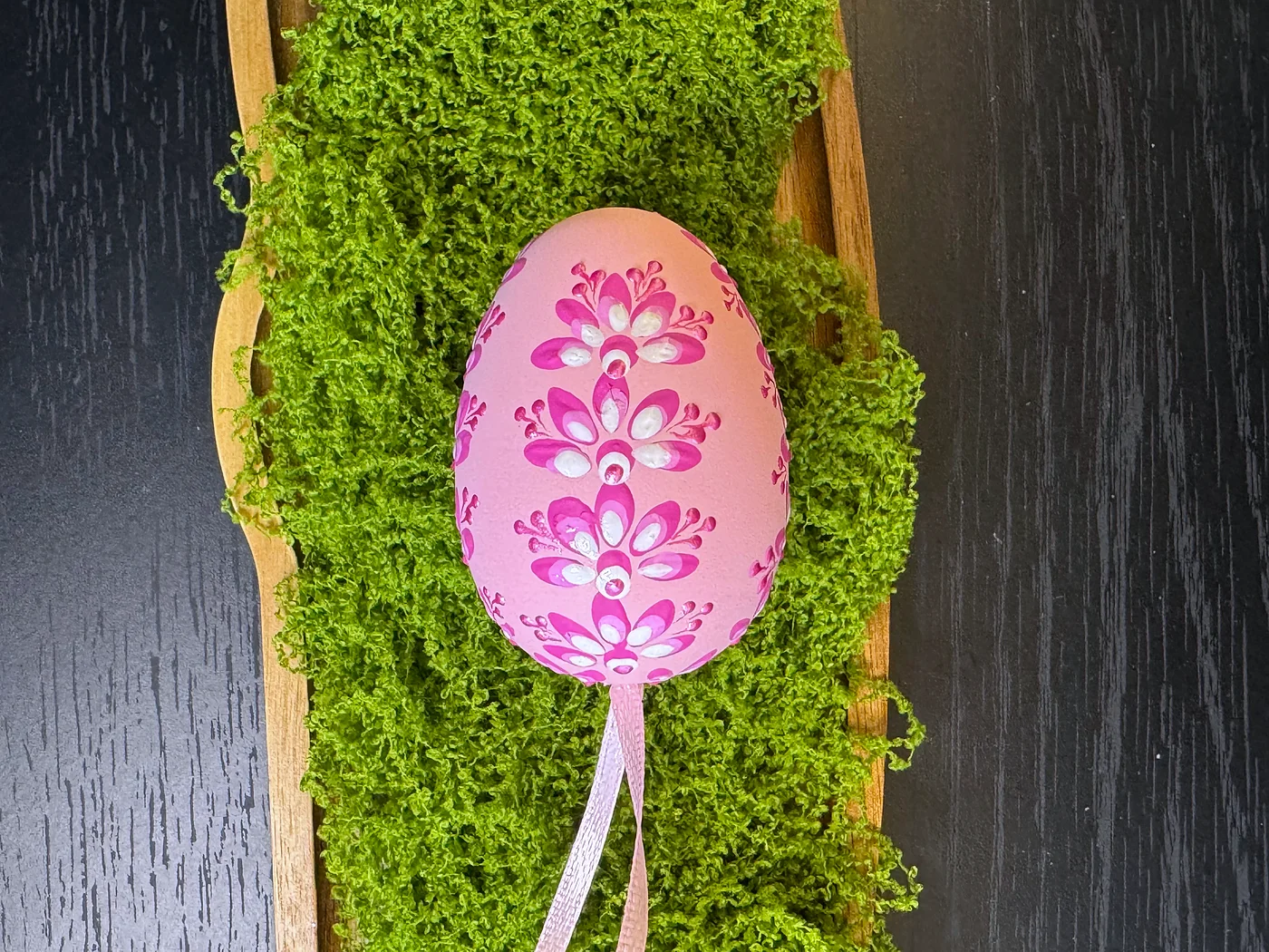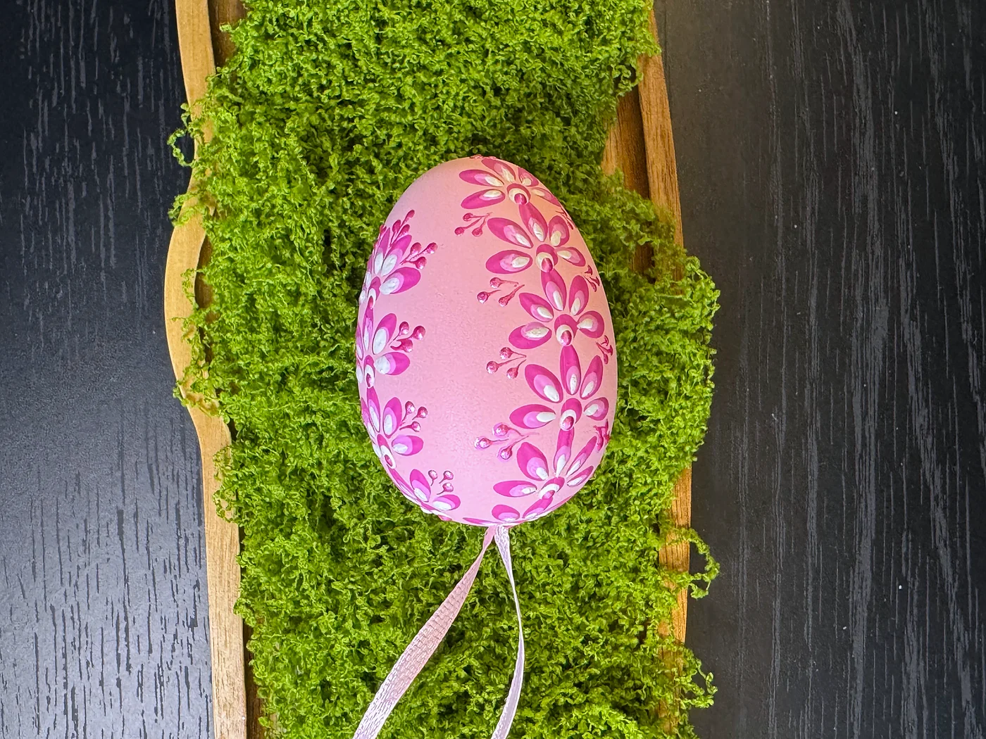 Nježno ružičasto jaje ukrašeno gracioznim okomitim buketom ručno oslikanih cvjetnih motiva u dubokoj magenti i bijeloj. Slojeviti potezi latica lepezasto se šire stvarajući efekt padajućeg buketa.