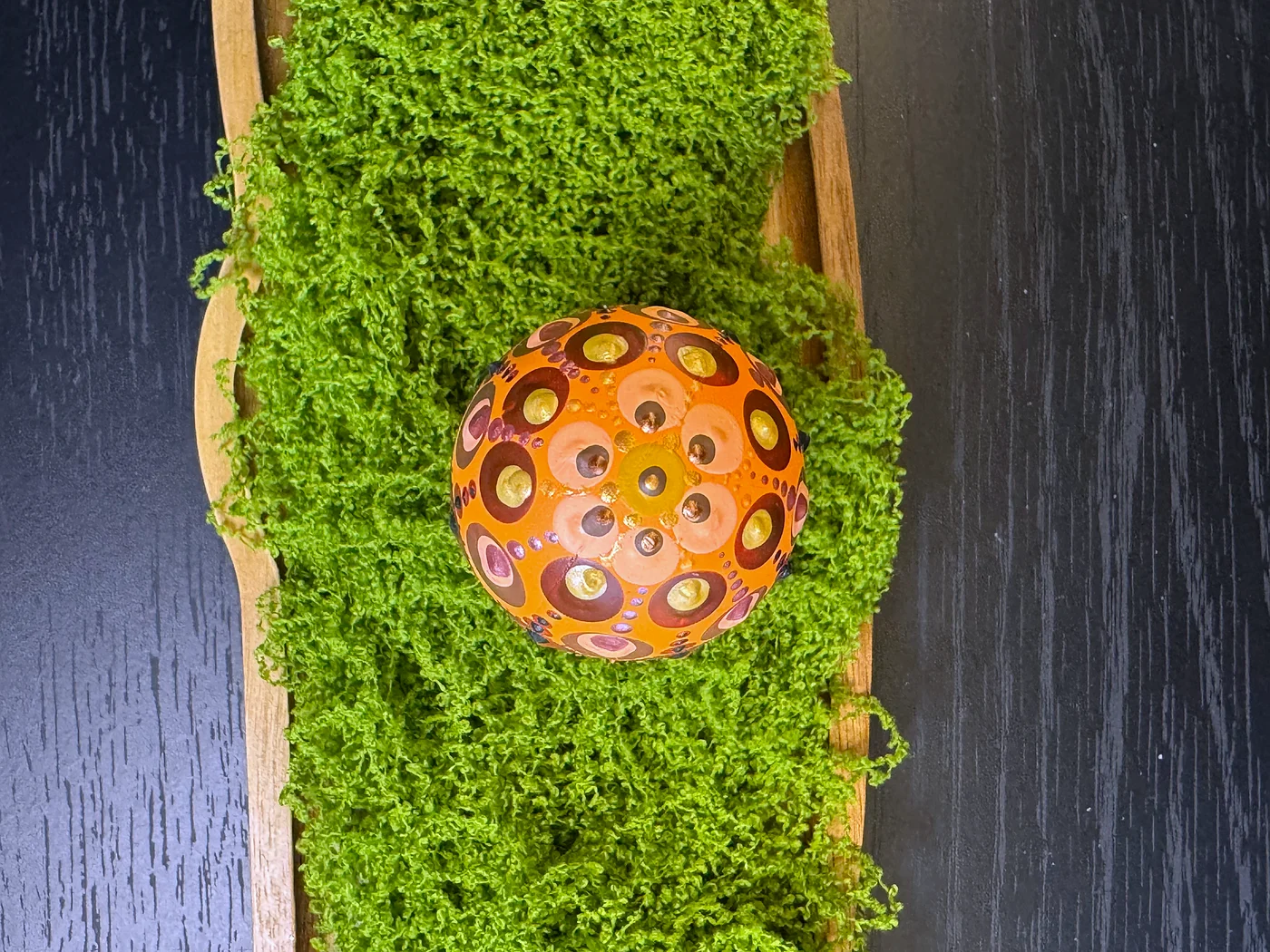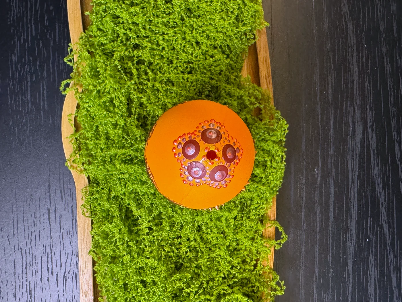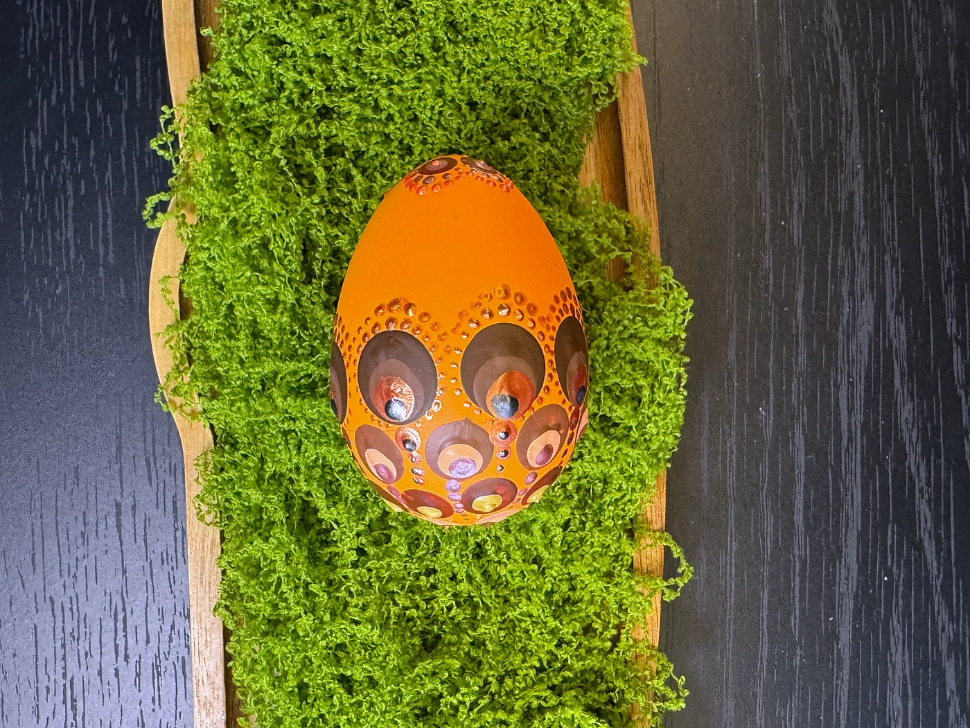 Toplo narančasto jaje s hipnotičkim motivima paunovog oka. Svako oko građeno je od koncentričnih prstenova duboke smeđe, tirkizne, ljubičaste i zlatnih tonova, stvarajući efekt dragulja.