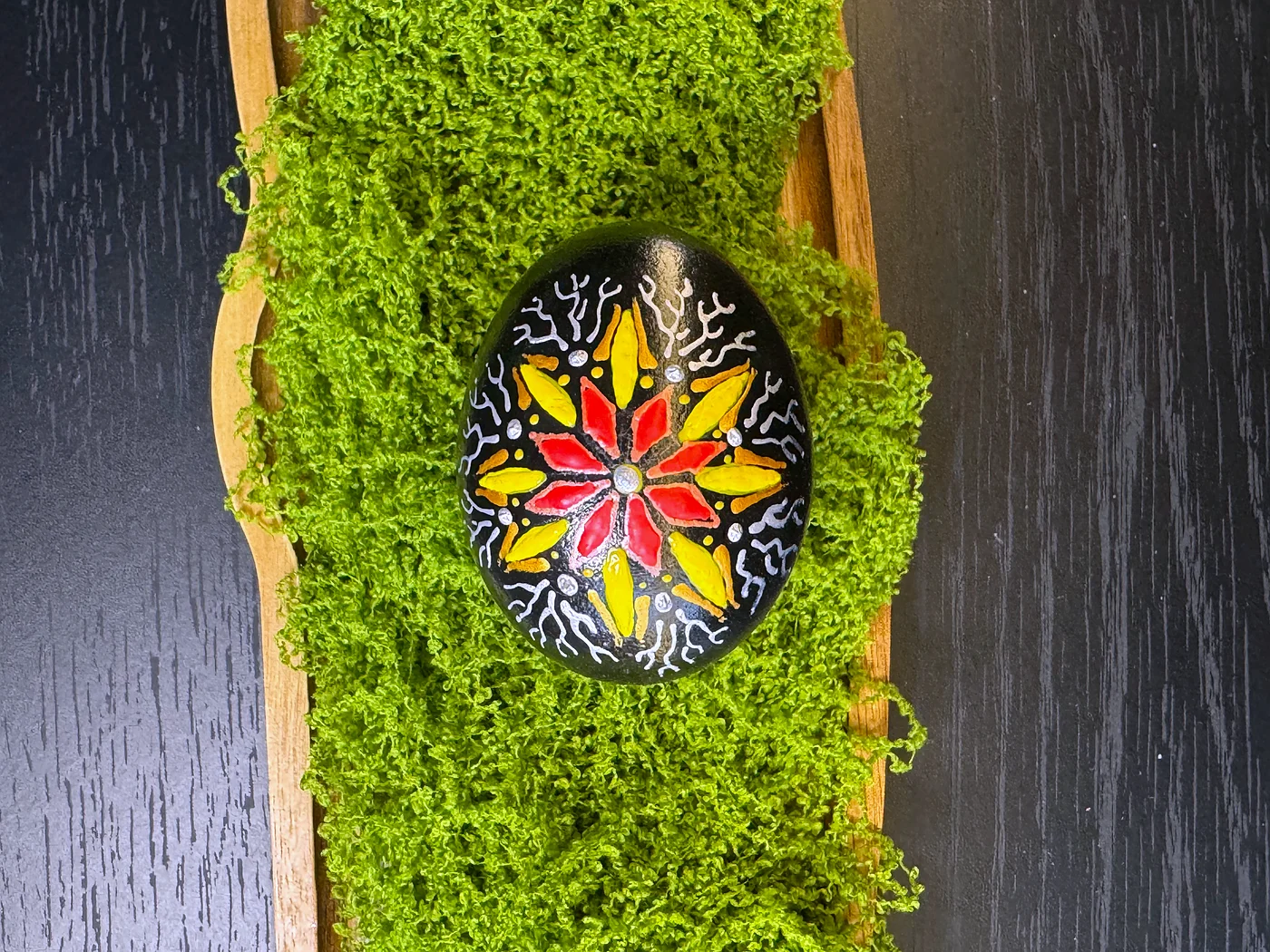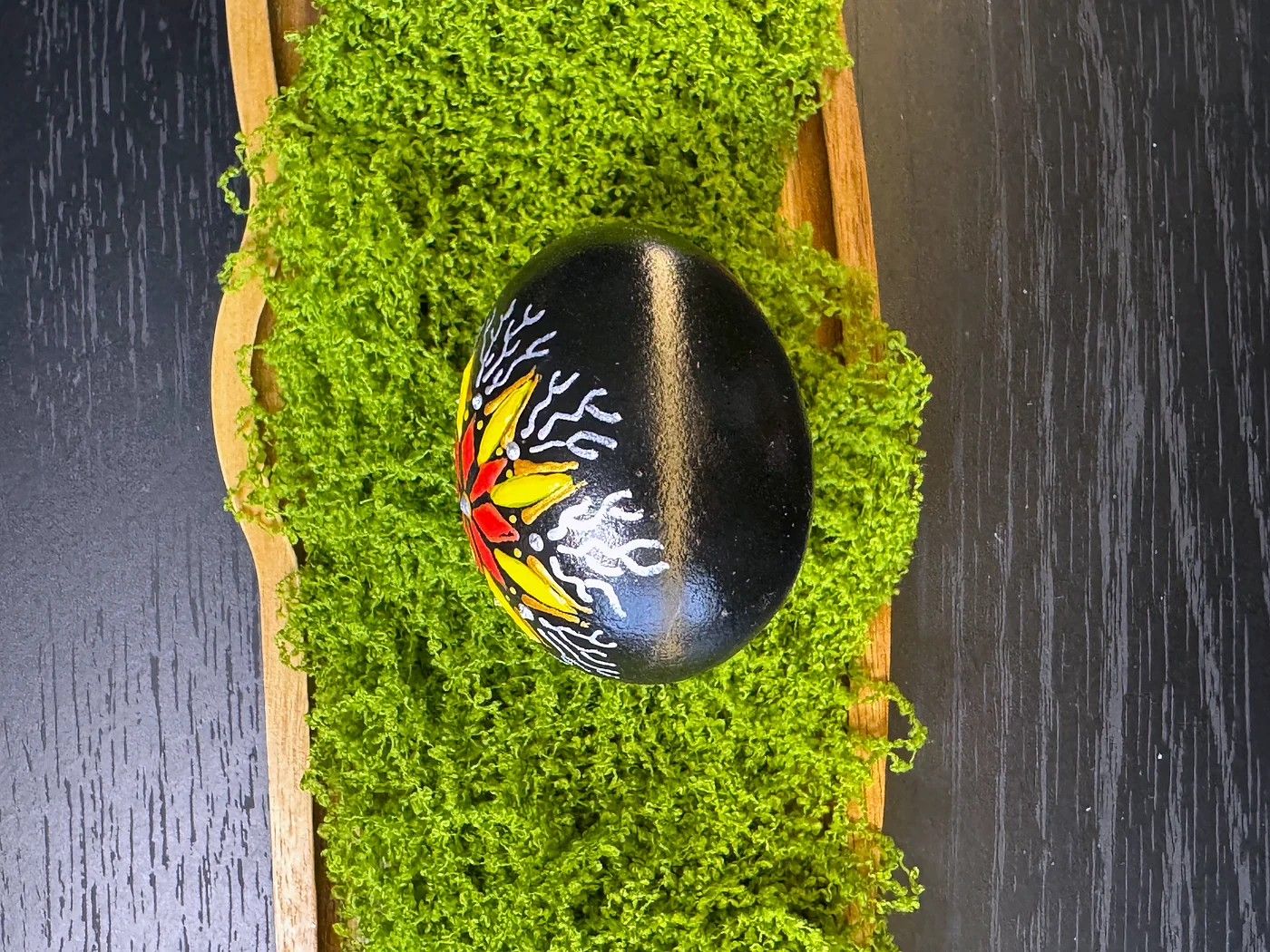 Ručno oslikan dizajn na crnoj obojenoj ljusci. Upečatljiv središnji zvjezdasti cvijet bukti u živopisnoj crvenoj, narančastoj i žutoj, obrubljen bijelim motivima nalik grančicama.