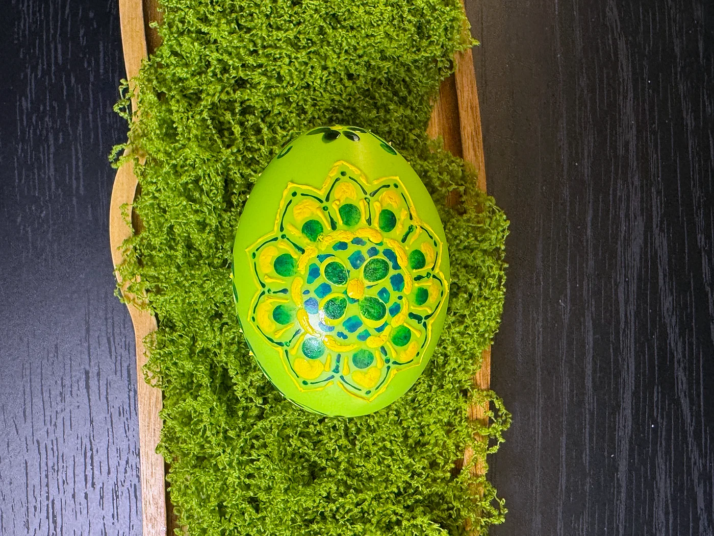 Jarko limeta-zeleno jaje prekriveno bujnim ručno oslikanim žutim i narančastim cvjetovima s tamnozelenim lišćem. Sitne bijele točkice akcentuiraju prostor između cvjetova.