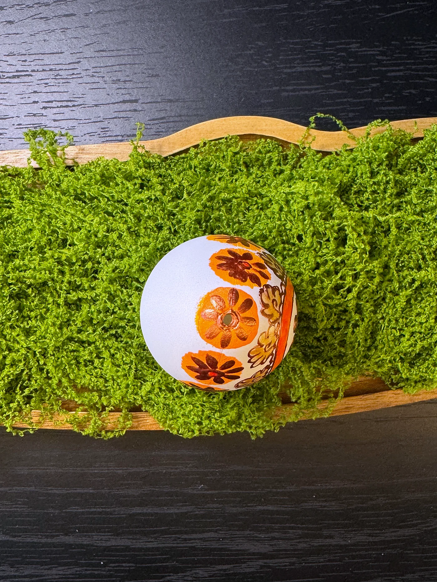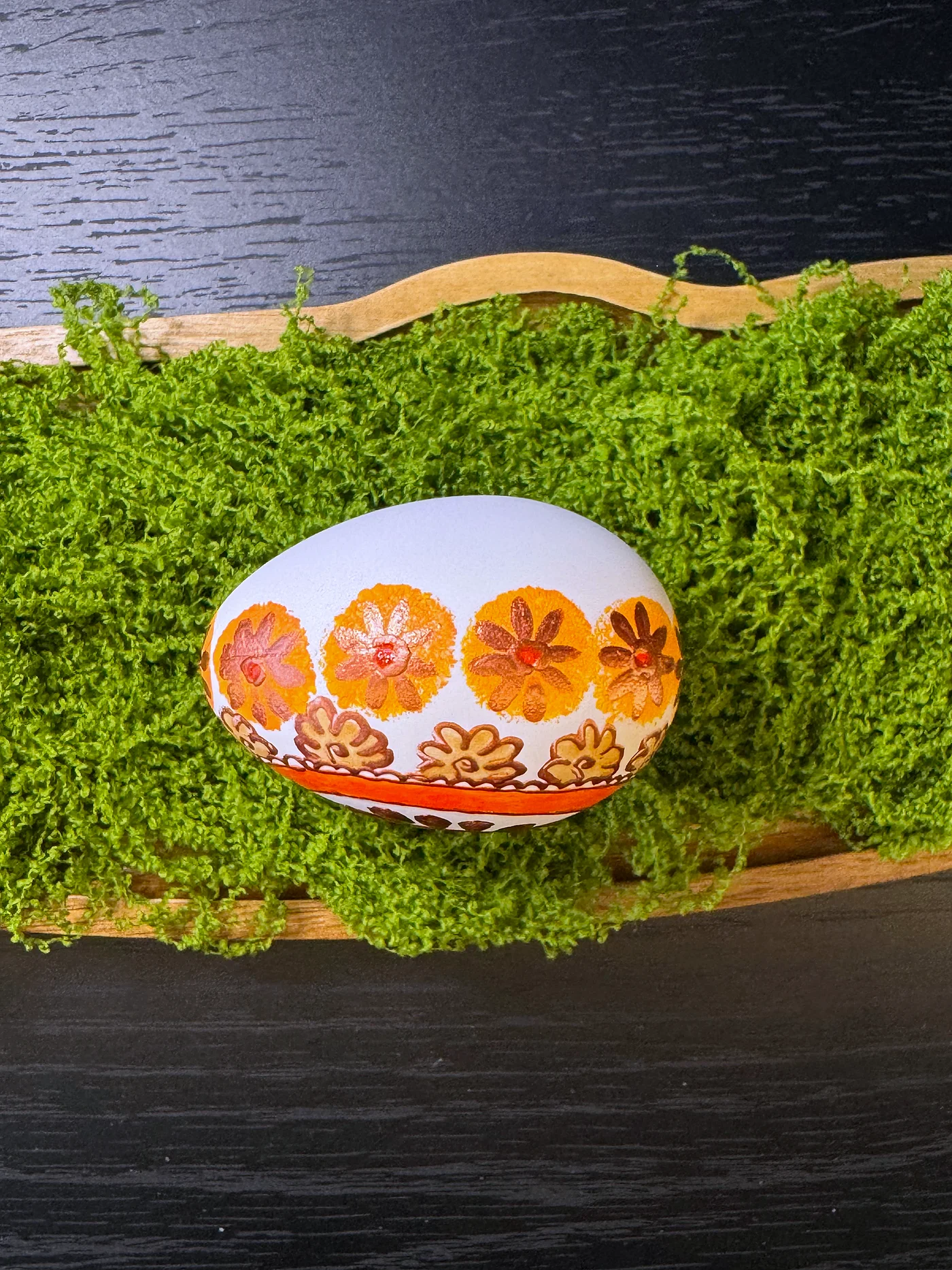 Toplo narančasto jaje s velikim medaljonom nalik mandali u sredini, izvedeno u tamnosmeđoj i krem boji. Koncentrični prstenovi kapljičastih latica i točkastih obruba šire se prema van.