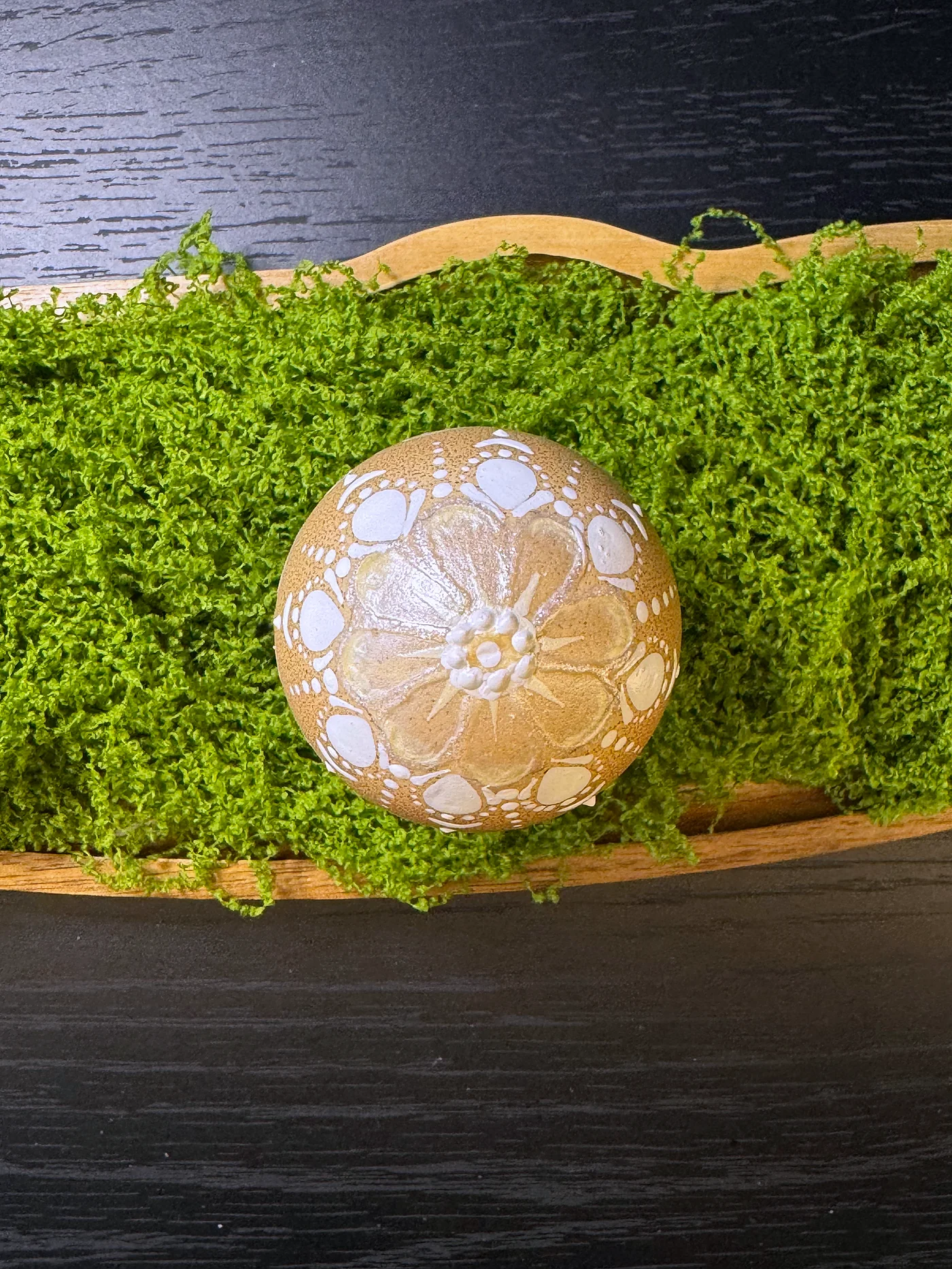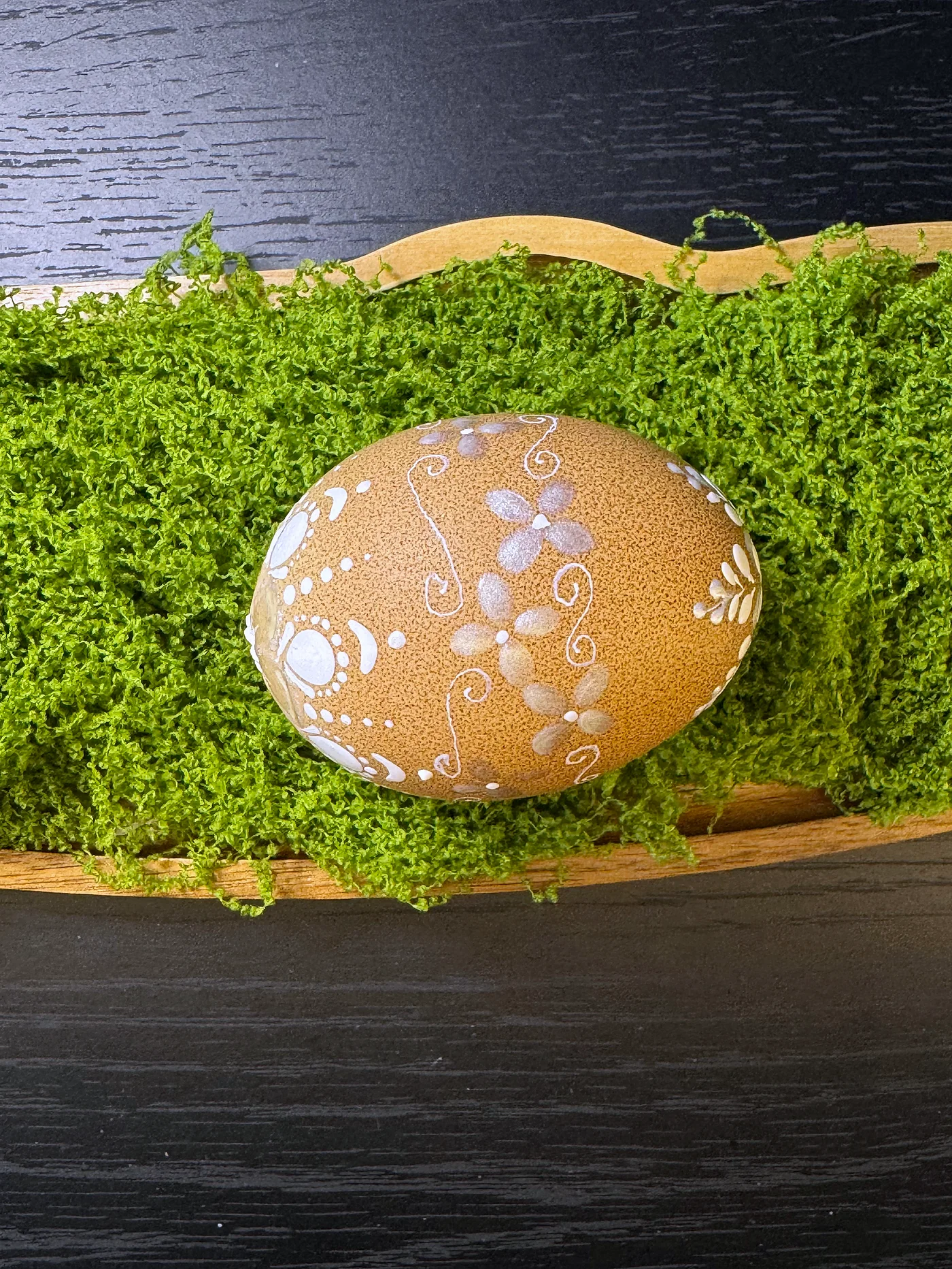 Prirodno smeđe jaje ukrašeno bijelim i srebrnim ručno oslikanim viticama. Vijugave loze, grozdovi točaka i lisne vitice krase toplu, zemljanu površinu.